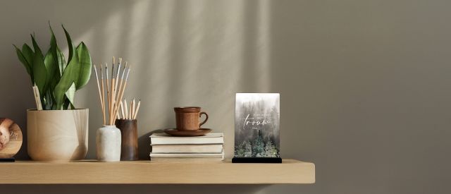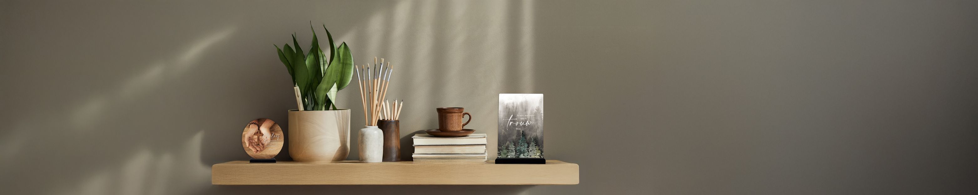 Onze cadeaubordjes zijn gemaakt van hoogwaardige materialen en hebben een compact formaat, waardoor ze eenvoudig in elk interieur passen. Hang ze op of zet ze neer als een dagelijks visueel bemoedigend symbool van geloof en hoop.