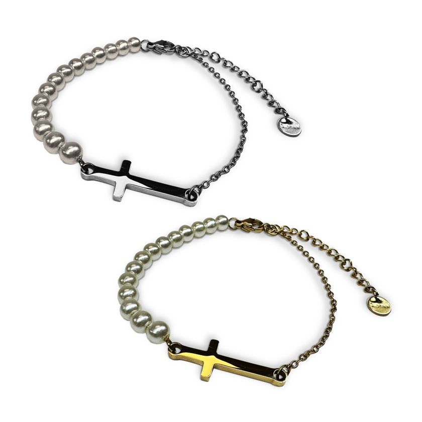 Verfijnde armband met kruisje en parels – een prachtige combinatie van geloof en tijdloze elegantie. Verkrijgbaar in goud- en zilverkleur.
