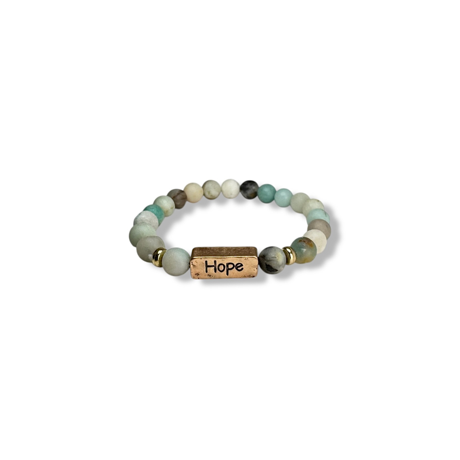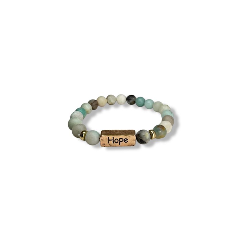 Prachtige natuurstenen armband met goudkleurige accenten en de gravure ‘Hope’.