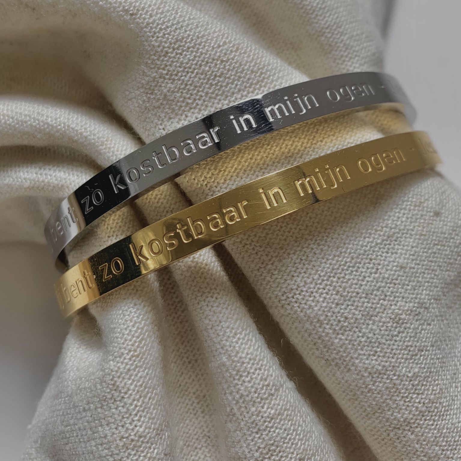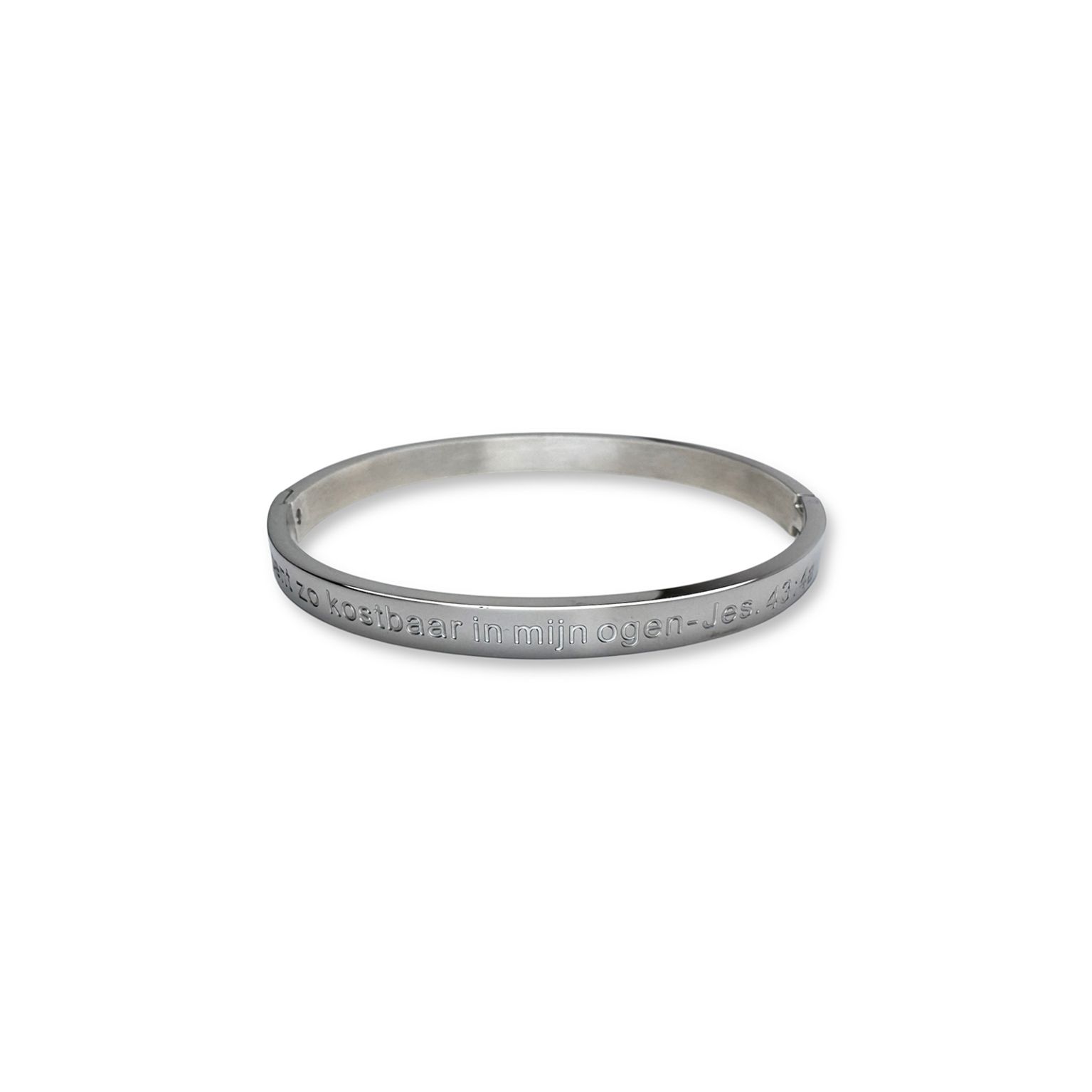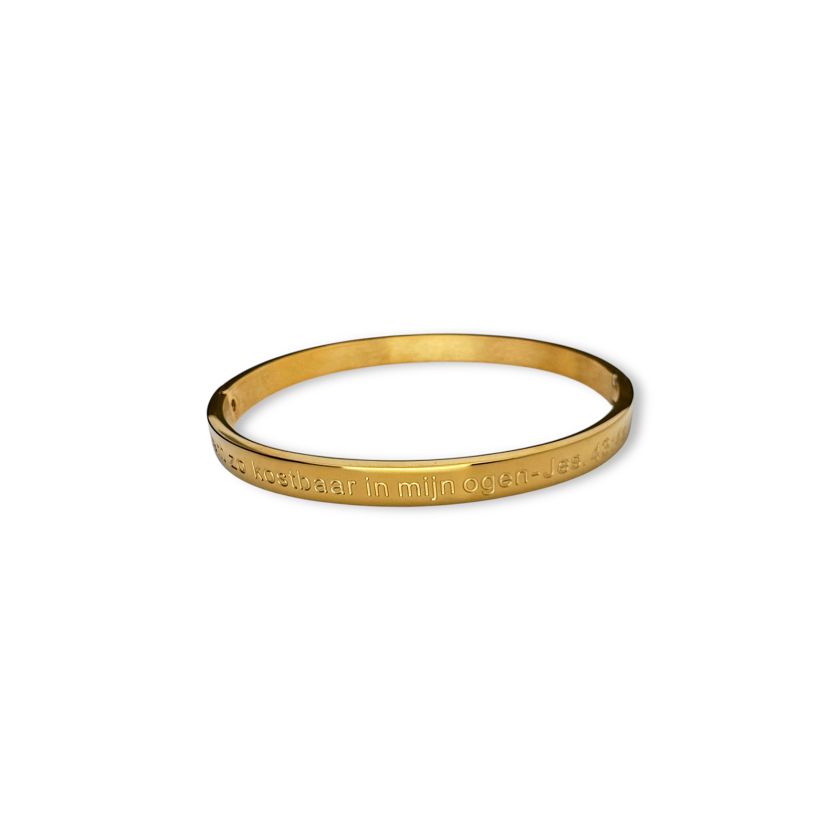 Draag een krachtige boodschap om je pols met deze elegante bangle, gegraveerd met de geliefde bijbeltekst uit Jesaja 43:4: ‘Jij bent zo kostbaar in mijn ogen.’ Verkrijgbaar in goud- en zilverkleur.