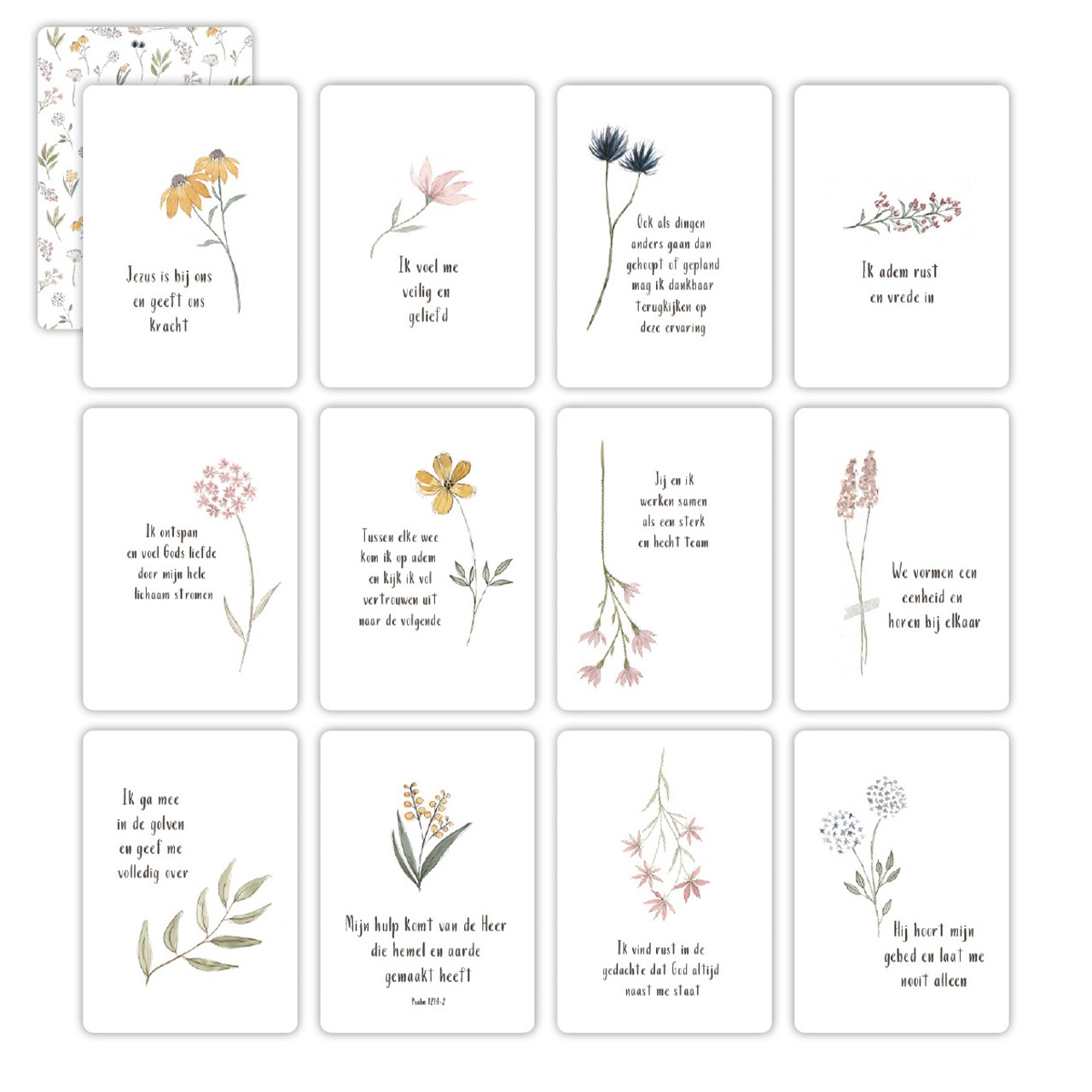 Luxe blik met venster. Met 12 prachtige, stevige kaarten met bemoedigende teksten voor tijdens de zwangerschap en/of bij de geboorte van je kind. De afbeeldingen zijn met de hand geïllustreerd. De kaarten zijn gedrukt op stevig papier, waardoor ze geschikt zijn om neer te zetten of op te hangen. Ook de achterkant is bedrukt, waardoor de kaart een mooi geheel vormt.