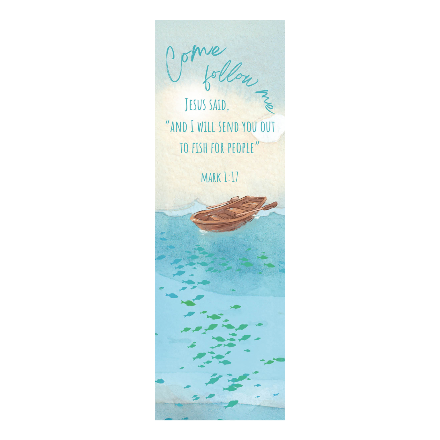 Deze boekenlegger symboliseert de roep van Jezus om Hem te volgen en dieper te gaan — niet alleen letterlijk het water op, maar ook geestelijk, de diepte in van geloof, vertrouwen en roeping.