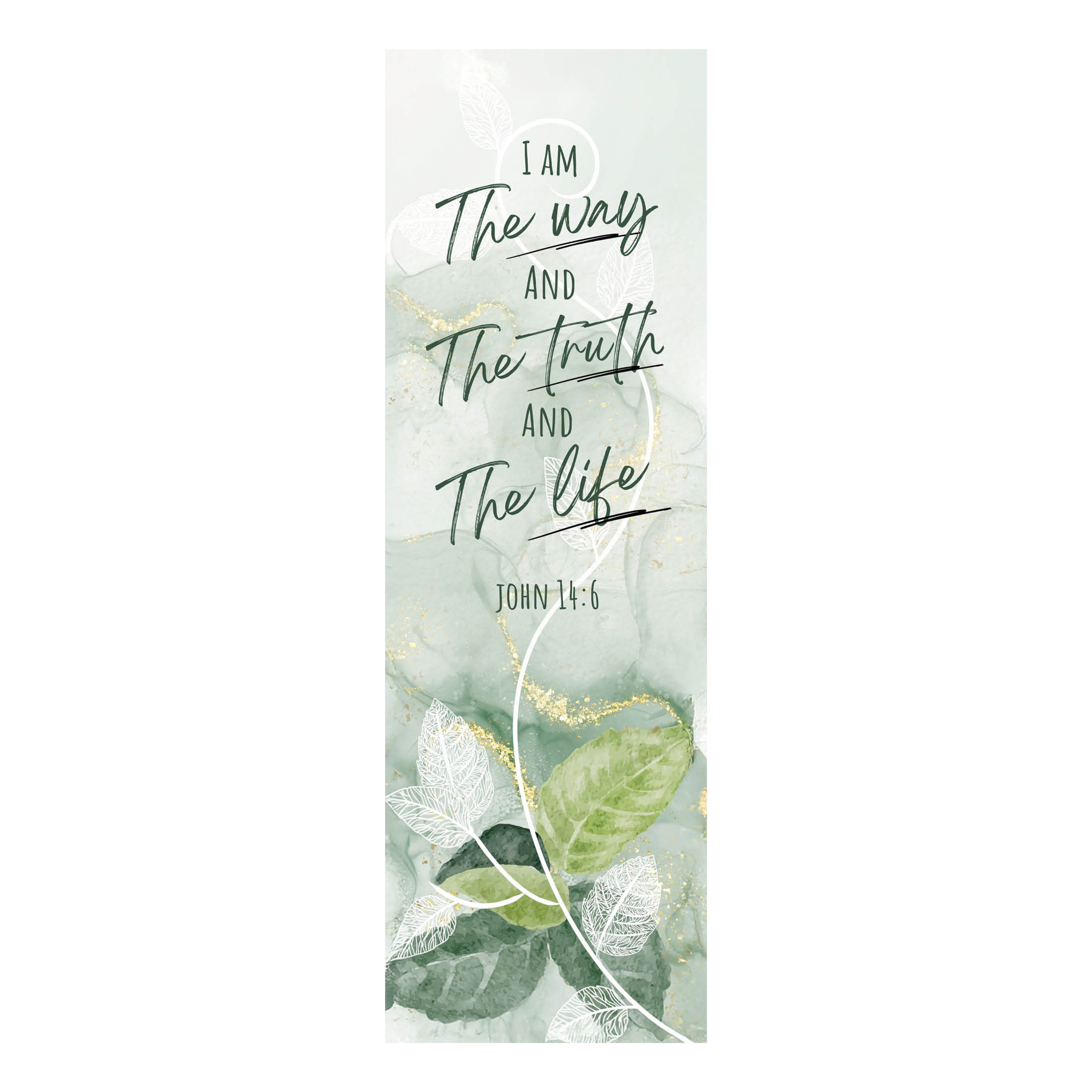 Deze boekenlegger is een herinnering dat Jezus de weg is naar vrede, waarheid en leven, omringd door de schoonheid van de natuur.
