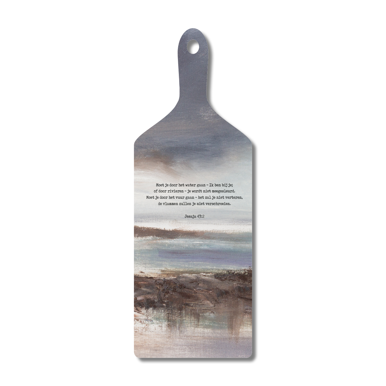 Op deze broodplank staat de bijbeltekst uit Jesaja 43:2: ‘Moet je door het water gaan – Ik ben bij je; of door rivieren – je wordt niet meegesleurd. Moet je door het vuur gaan – het zal je niet verteren, de vlammen zullen je niet verschroeien.’
