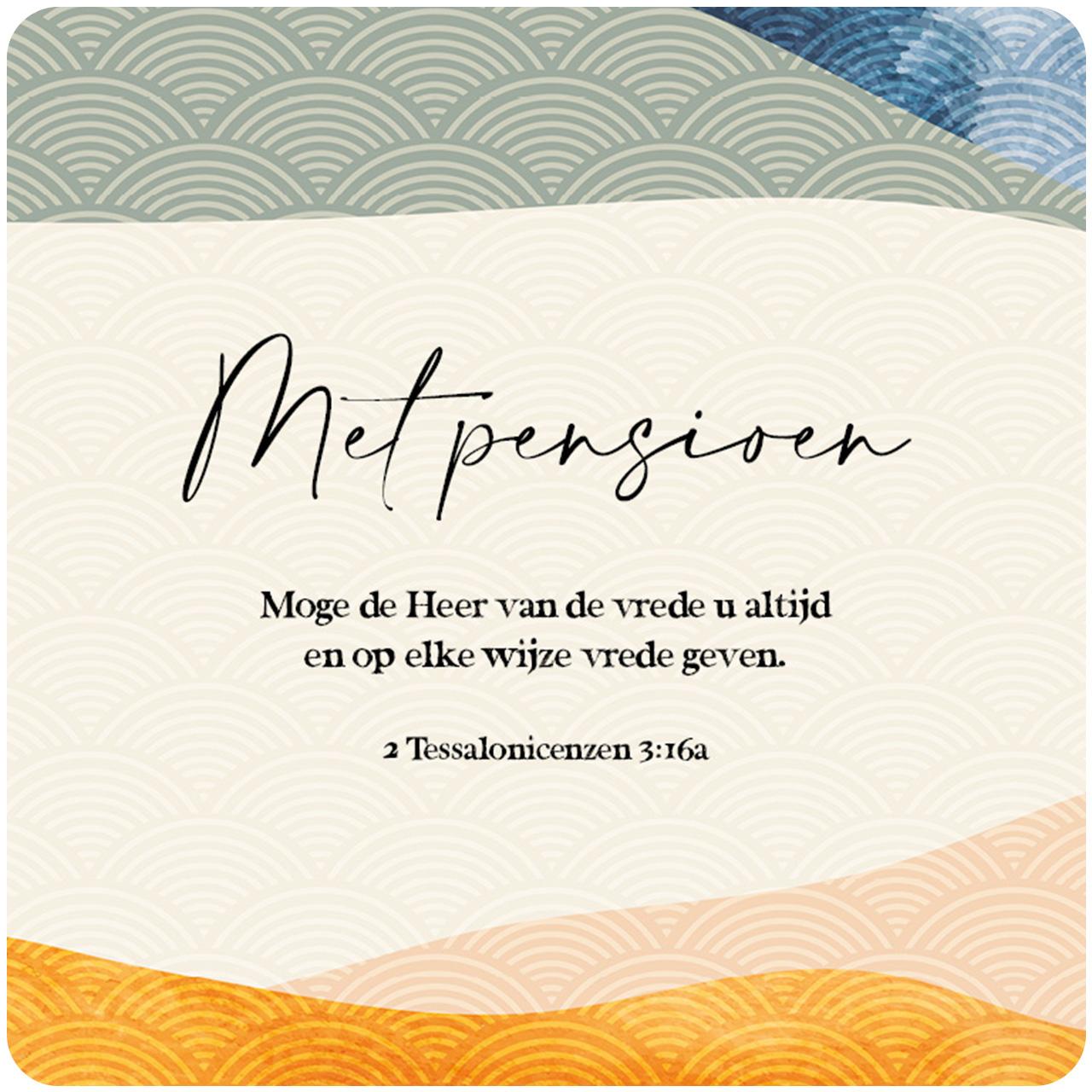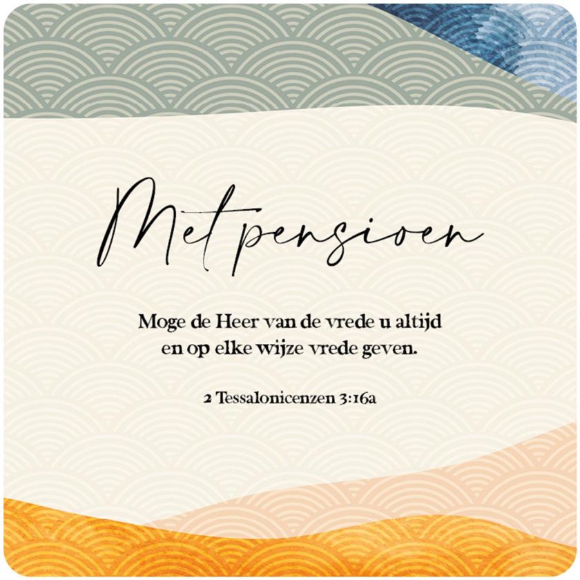 Prachtig Courage cadeaubordje met de tekst ‘Met pensioen. Moge de Heer van de vrede u altijd en op elke wijze vrede geven. 2 Tessalonicenzen 3:16a’.