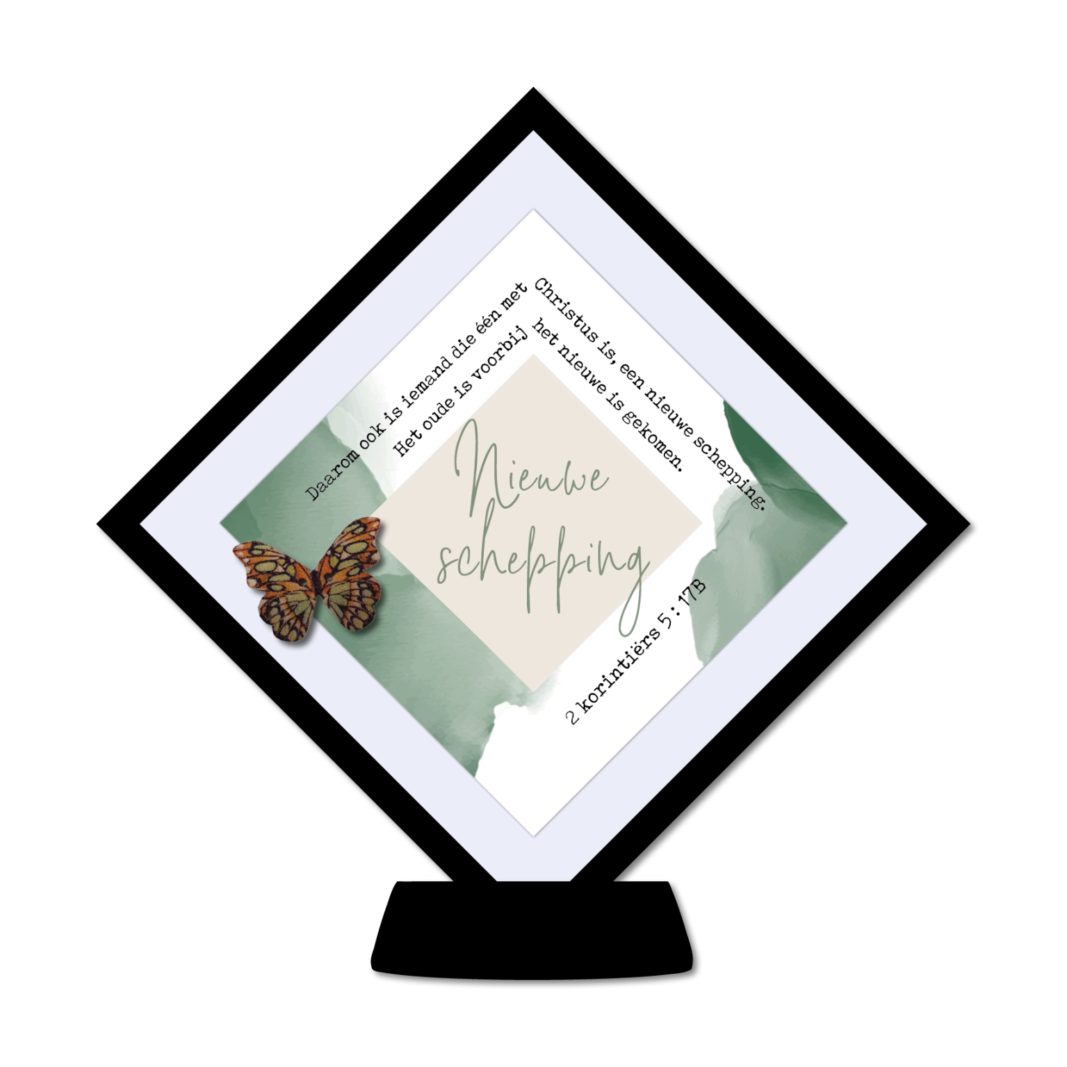 De tekst op het kaartje komt uit 2 Korintiërs 5:17b: Daarom ook is iemand die één met Christus is, een nieuwe schepping. Het oude is voorbij, het nieuwe is gekomen.