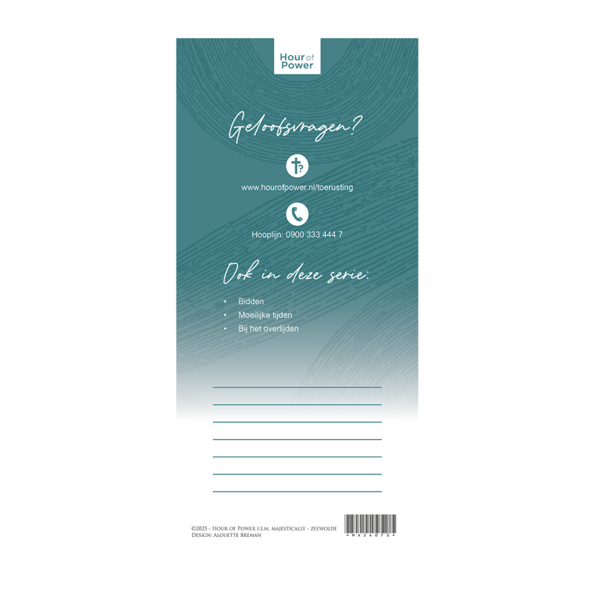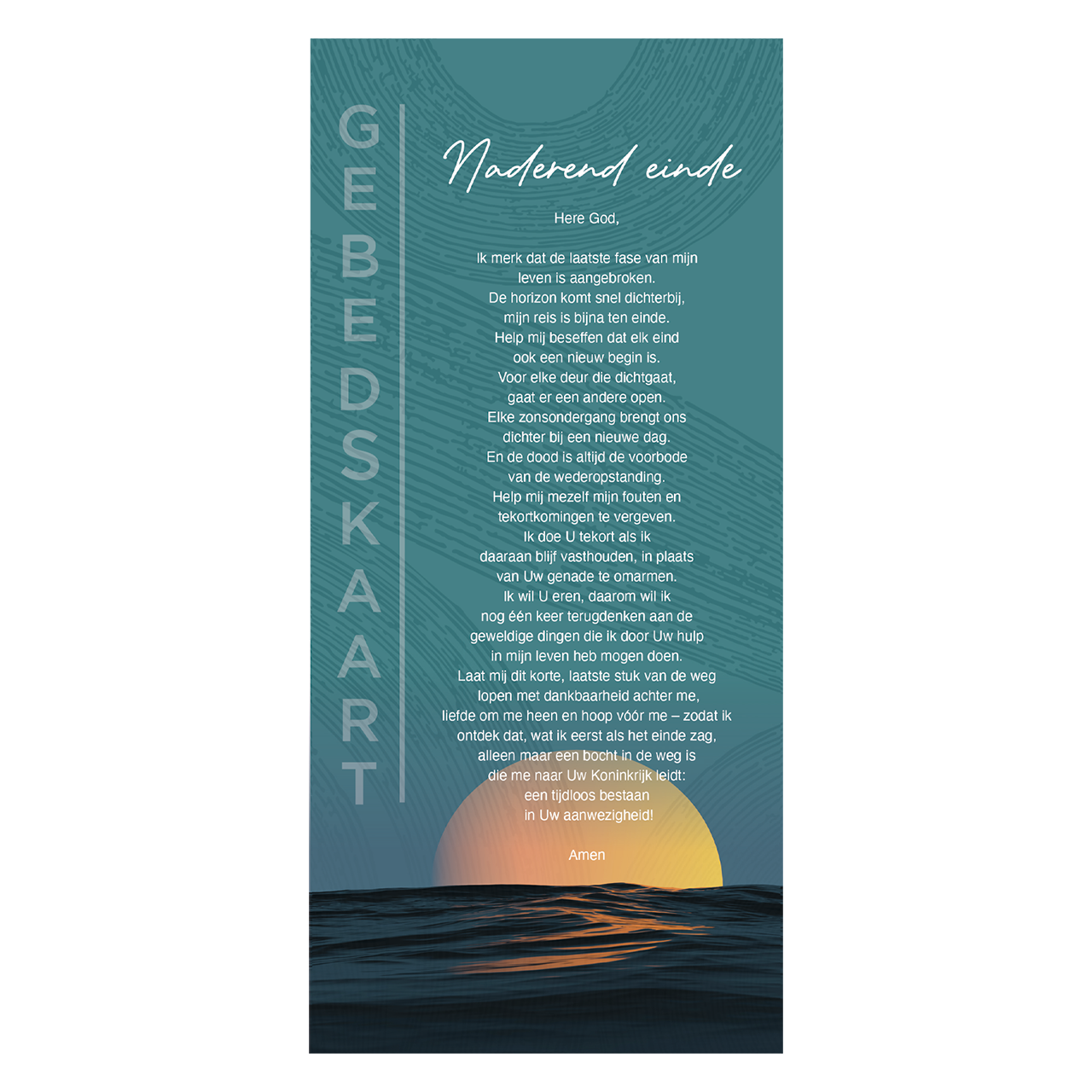 Deze gebedskaart is speciaal ontworpen voor momenten rond het naderende levenseinde. Het gebed vraagt om innerlijke rust, zonder aanvechting en benadrukt Gods genade en dankbaarheid voor het geleefde leven. Een waardevolle en troostrijke tekst om samen te bidden en steun te vinden in geloof en verbondenheid.