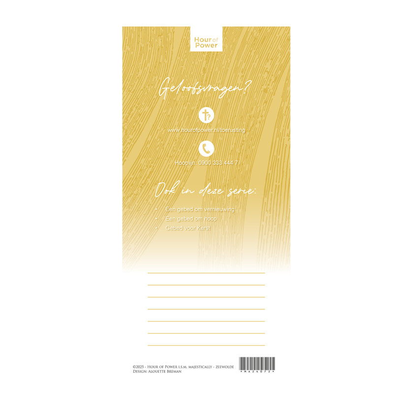 Deze gebedskaart bevat een inspirerend gebed, perfect om iemand toe te wensen of zelf te bidden. Het herinnert eraan altijd hoop te houden en het licht te blijven zien, zelfs achter de donkere wolken. Een waardevolle boodschap van kracht en vertrouwen.