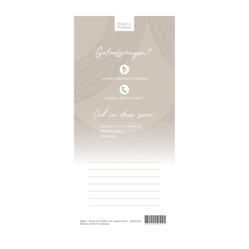 Deze sfeervolle gebedskaart is perfect voor momenten van onzekerheid en zorgen over de toekomst. Ideaal om samen met iemand te bidden of als betekenisvol geschenk om hoop en troost te bieden.