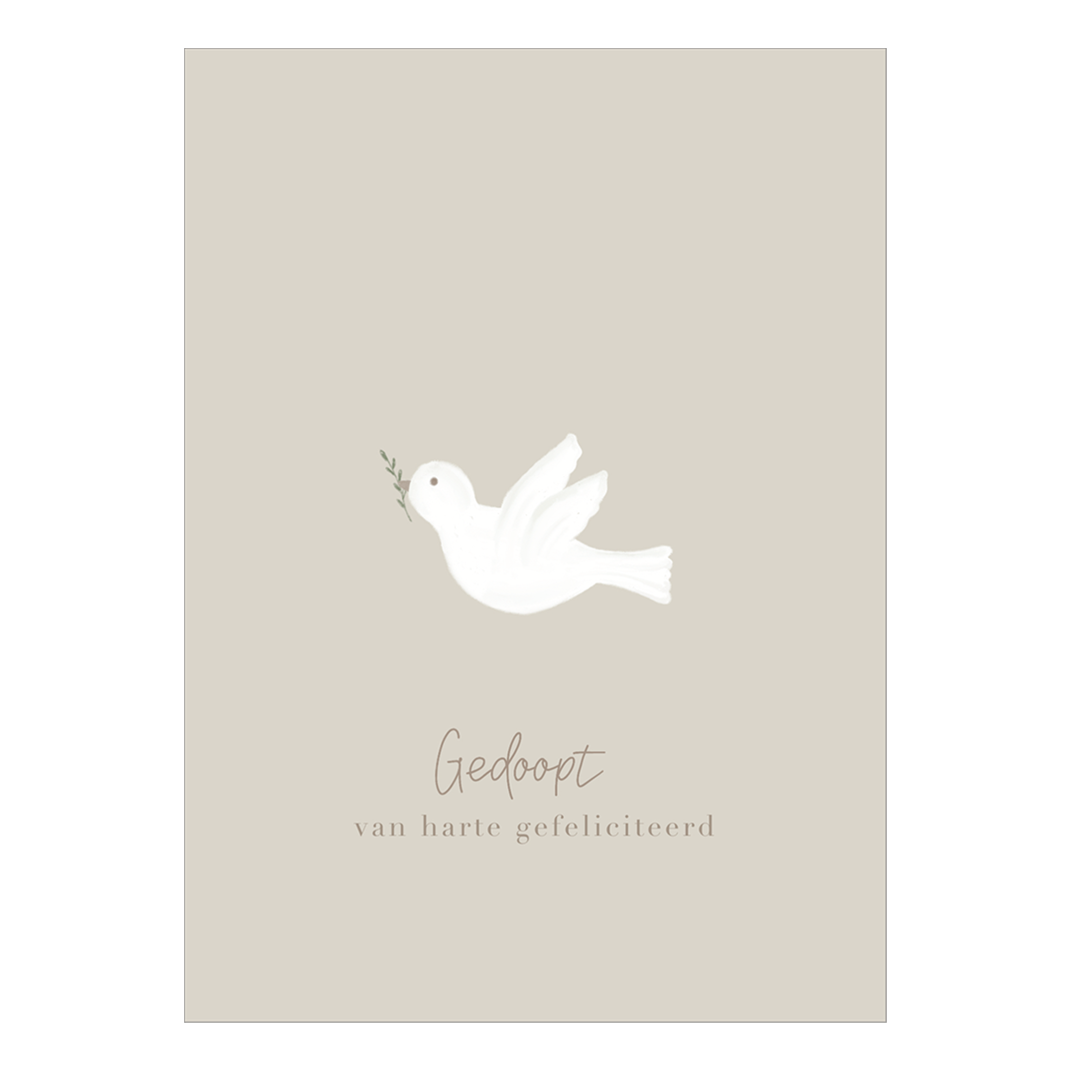 Een enkele kaart op dik papier met de afbeelding van een duif en de tekst ‘Gedoopt van harte gefeliciteerd.’ Geschikt voor zowel kinder- als volwassendoop.