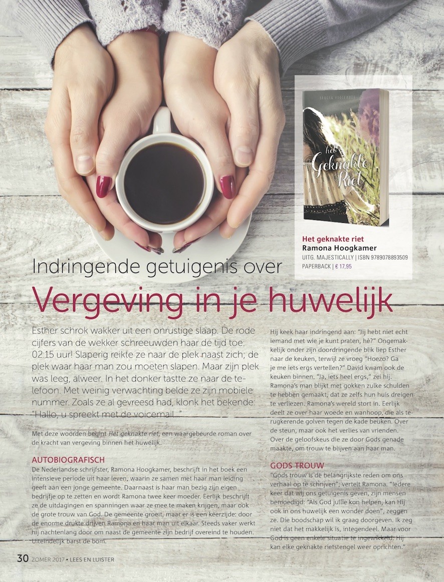 Ramona Hoogkamer: “Gods trouw is de belangrijkste reden om ons verhaal op te schrijven. Iedere keer dat wij ons getuigenis gaven, werden mensen bemoedigd. Als God ons kon helpen, kan hij ook anderen helpen door in hun huwelijk een wonder te doen. Dat wil ik graag doorgeven. Ik zeg niet dat het makkelijk is, integendeel. Maar voor God is geen enkele situatie te ingewikkeld. Hij kan elke geknakte rietstengel weer oprichten.”