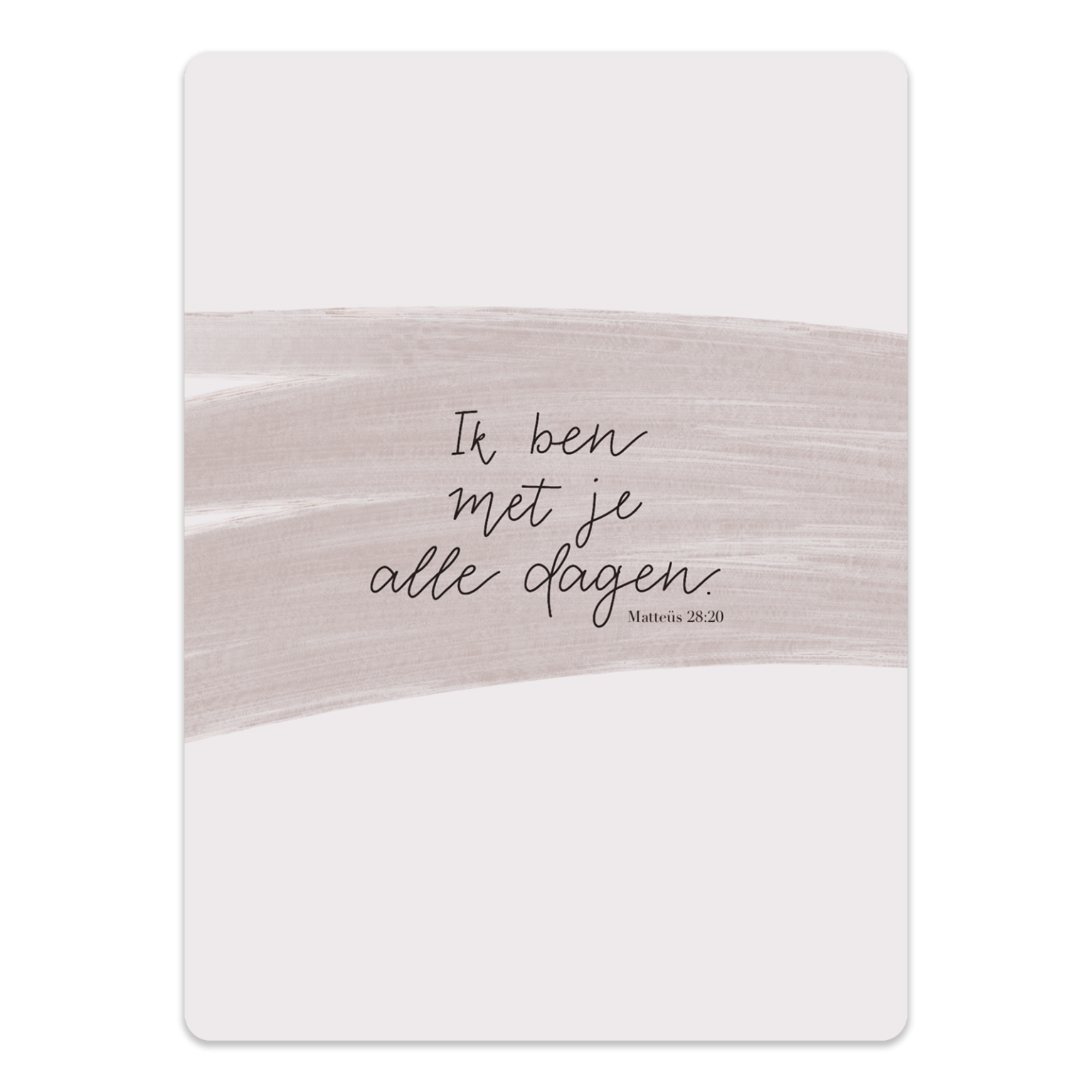 Cadeaubord met de inspirerende tekst ‘Ik ben met je alle dagen’ uit Matteüs 28:20. Een betekenisvol en stijlvol decoratief bord, perfect om neer te zetten of als bemoedigend cadeau voor elke gelegenheid.