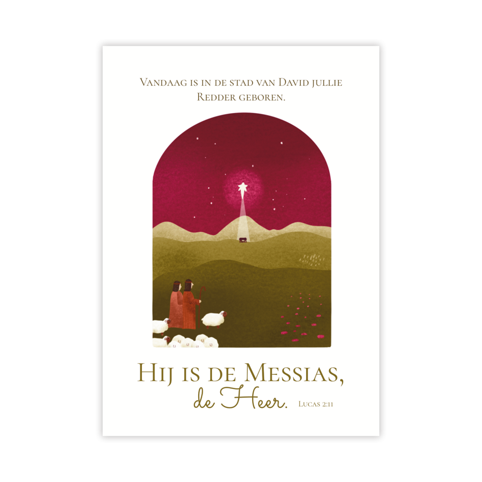 Een prachtige kaart met herders en schapen die uitkijken naar de heldere ster boven Bethlehem. Met Lucas 2:11: ‘Hij is de Messias, de Heer.’