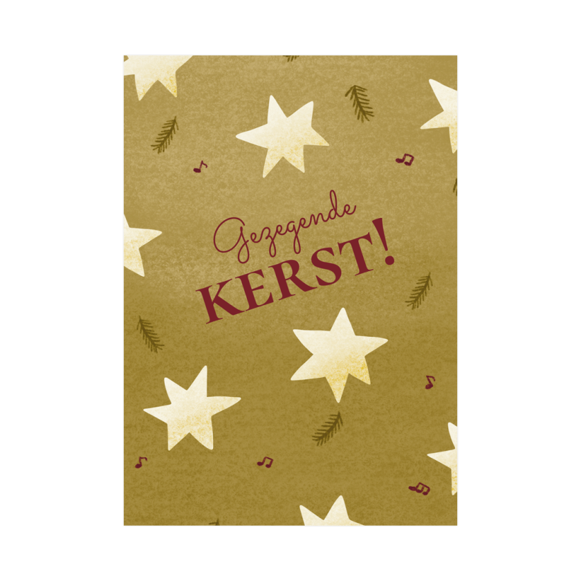 Een feestelijke kaart met dansende sterren, dennentakjes en kleine muzieknootjes op een kleurige achtergrond. Met de tekst ‘Gezegende Kerst’ wens je stralende feestdagen toe.