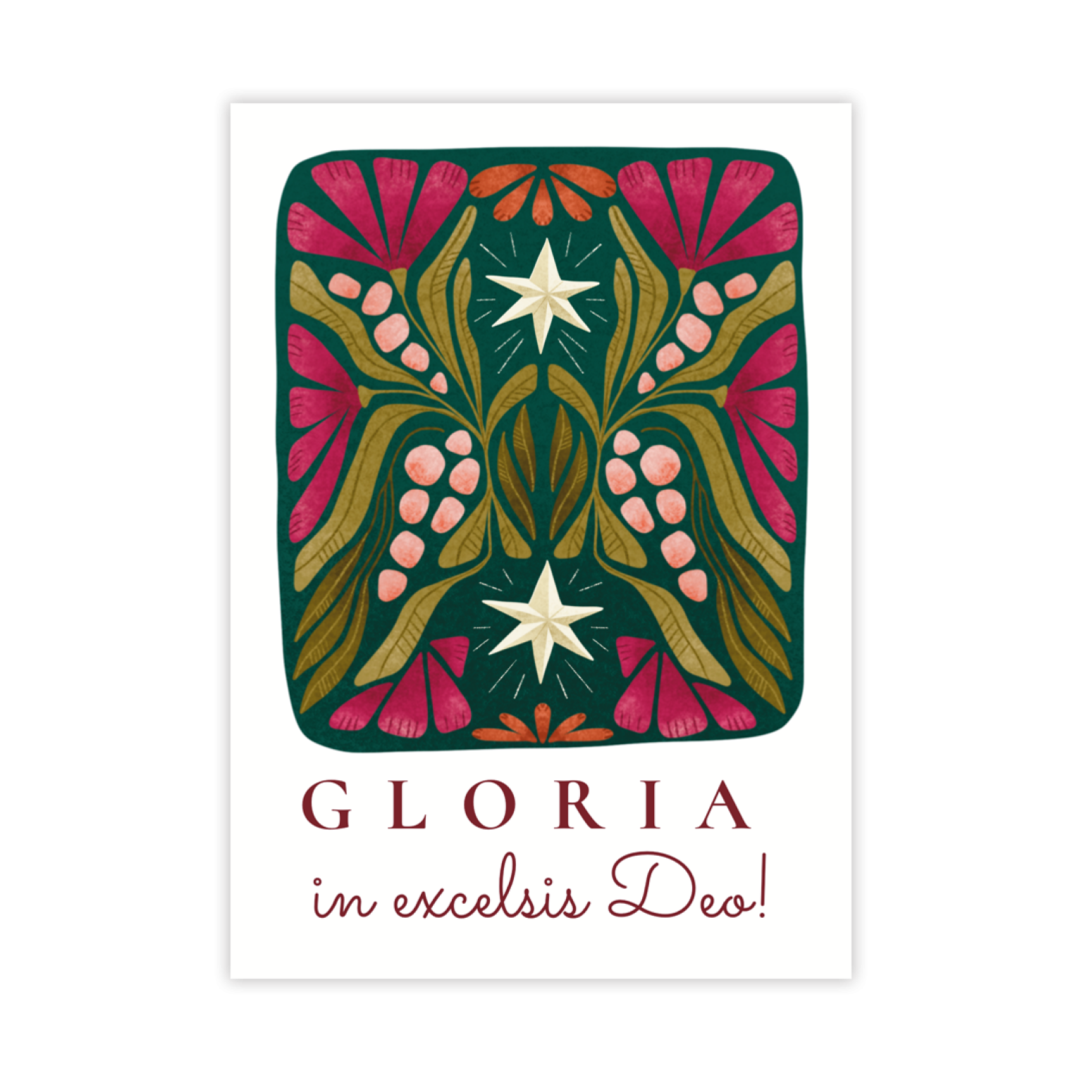 Deze kaart laat twee stralende sterren zien tussen kleurrijke bloemen en takken en de tekst ‘Gloria in excelsis Deo’.