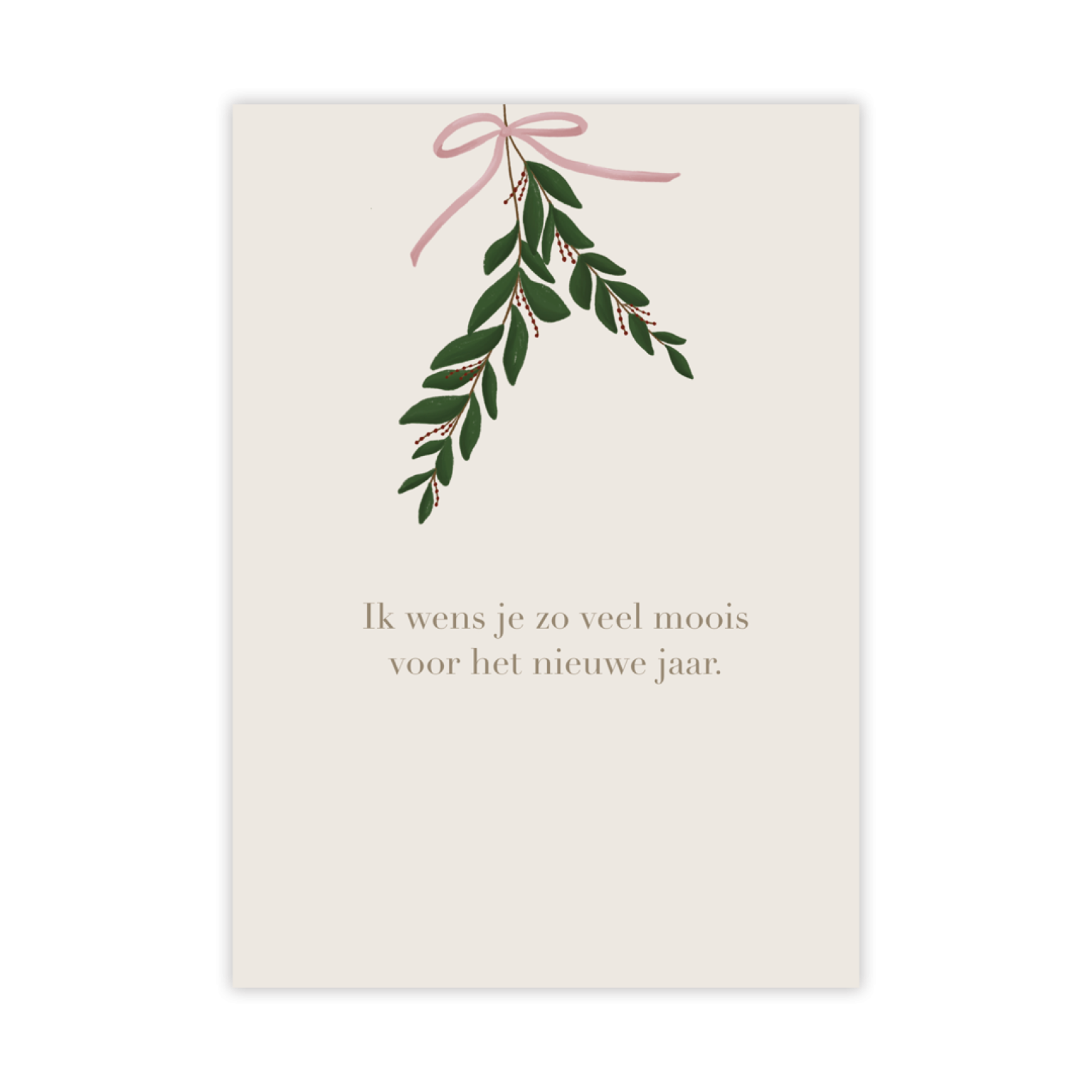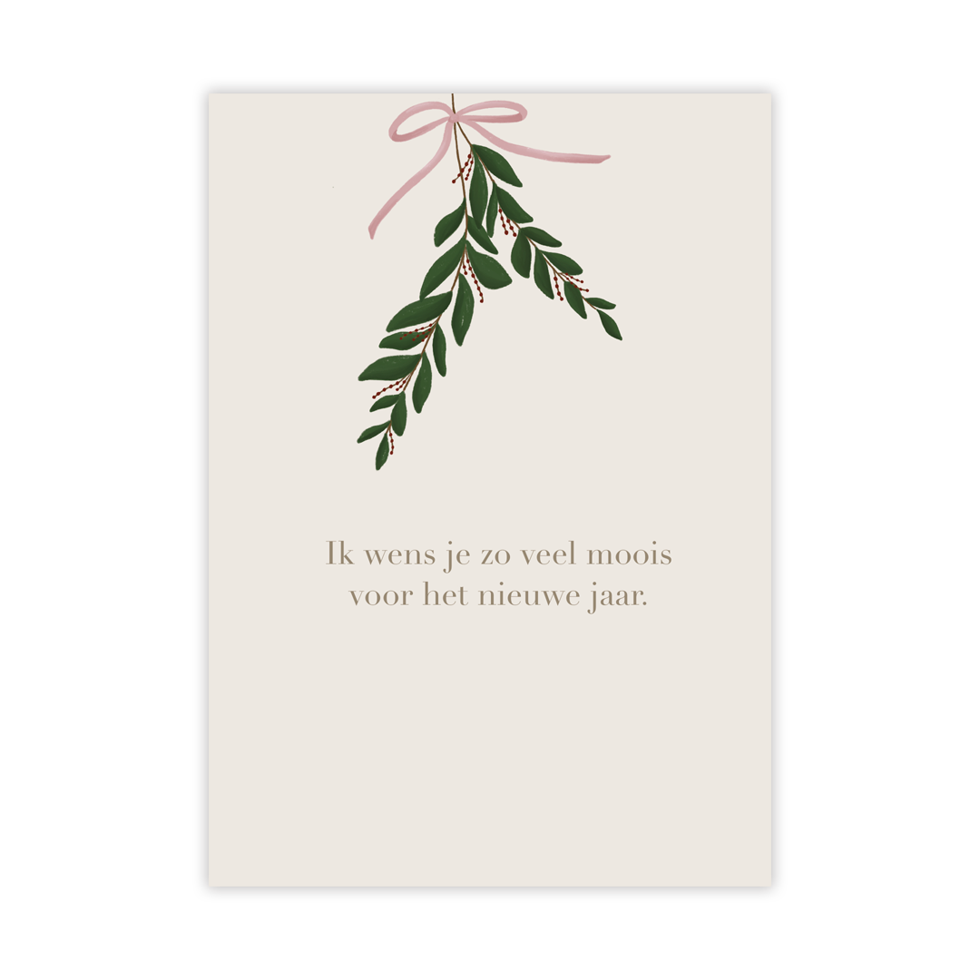 Een elegante kerstkaart met een groene tak en een roze strik. De kaart bevat de tekst: Ik wens je zo veel moois voor het nieuwe jaar. Perfect om nieuwjaarswensen in stijl te versturen. Inclusief envelop en ook verkrijgbaar in een voordeelpakje.