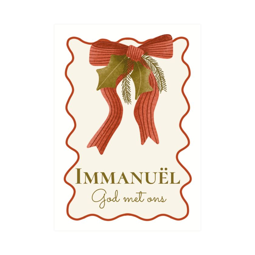 Een elegante kaart met een grote rode strik, groene bladeren en dennentak. Met de woorden ‘Immanuël, God met ons’ deel je de bemoedigende boodschap van Gods nabijheid.