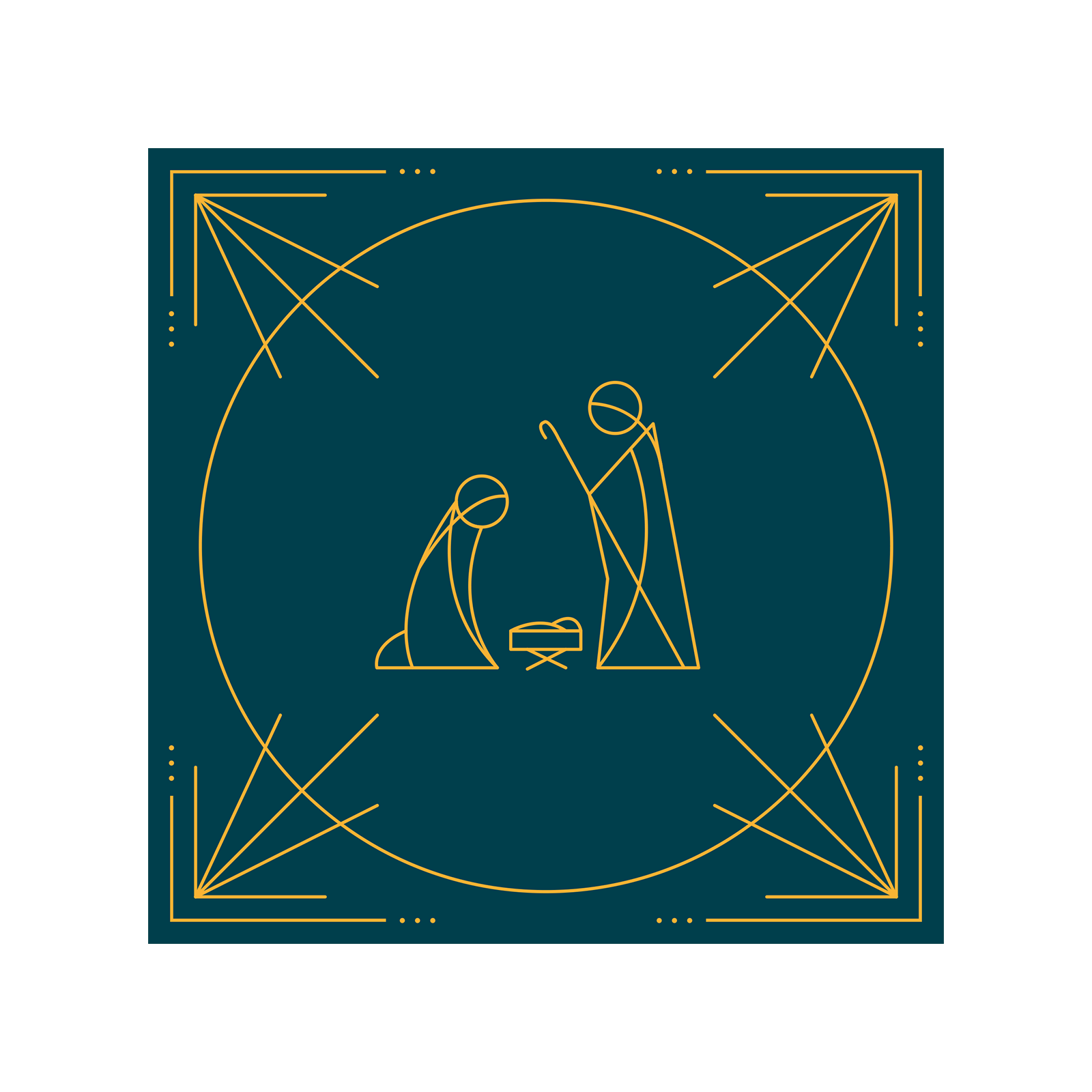Christelijke kerstkaart met een minimalistische illustratie van de kerststal, bedrukt met goudfolie.