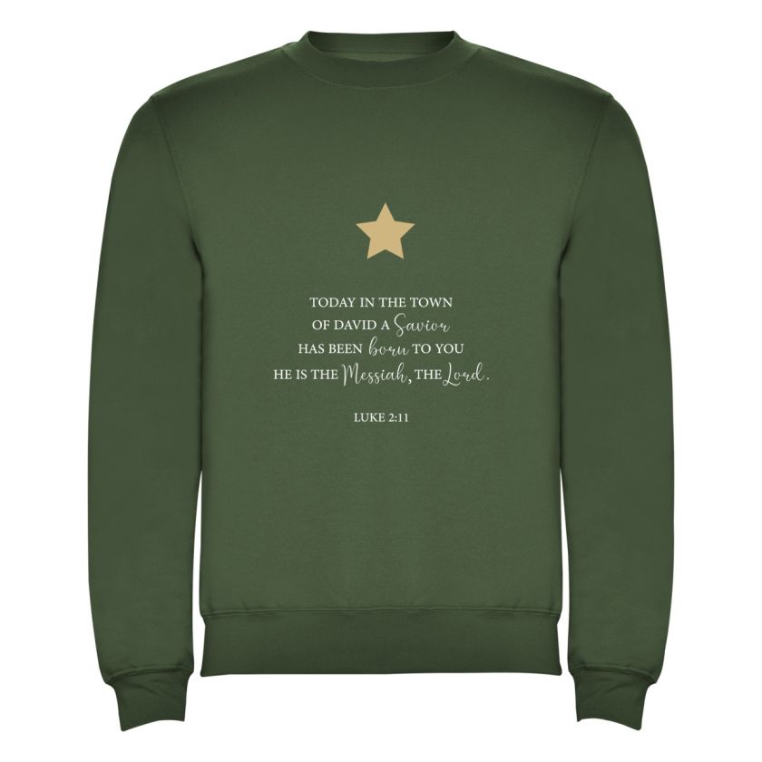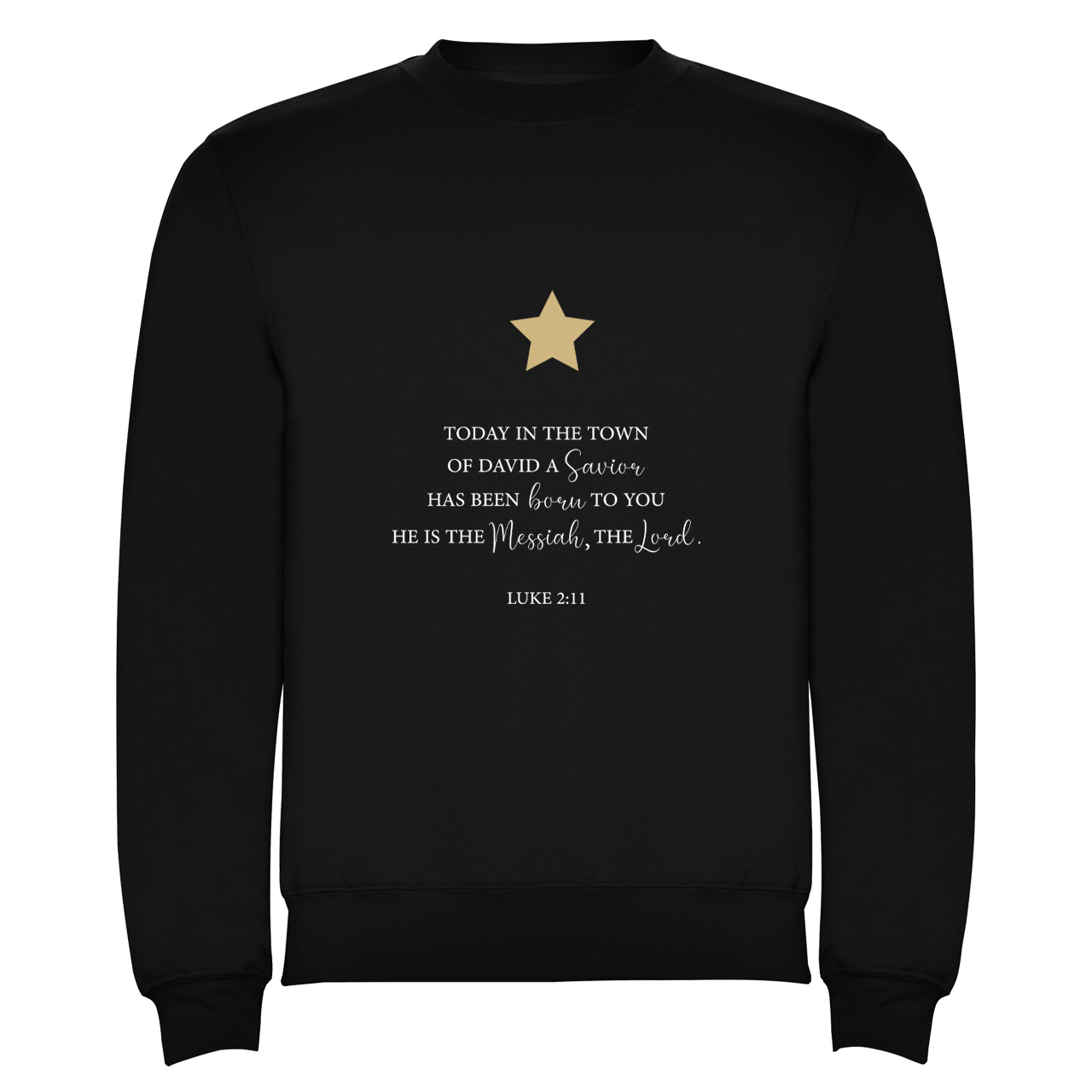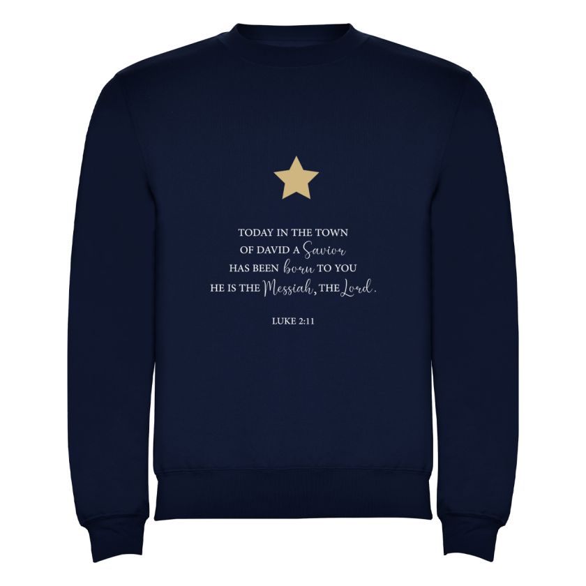 Met een grote print op de voorzijde met de inspirerende tekst uit Lucas 2:11 en een gouden ster straalt deze trui de ware kerstboodschap uit.