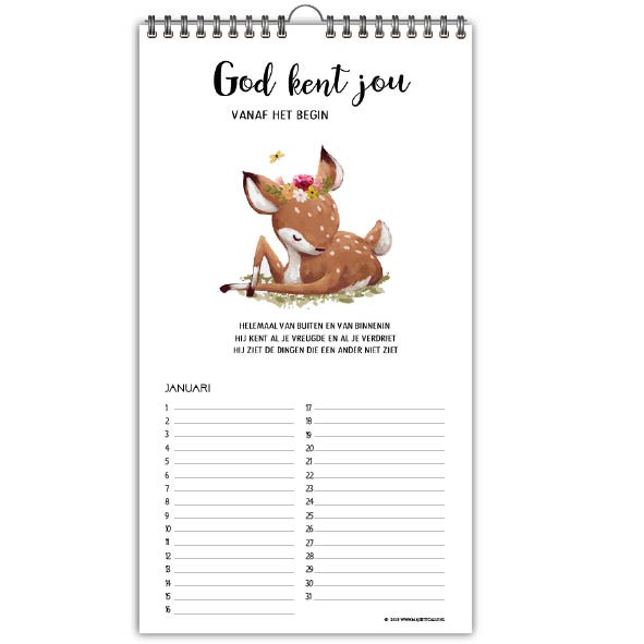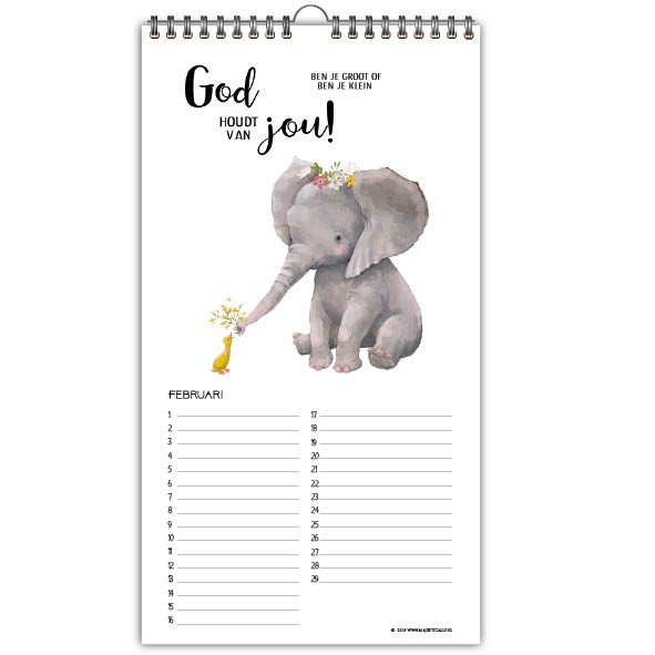 Creatieve verjaardagskalender met vrolijke dieren en tekstfragmenten uit christelijke kinderliedjes.