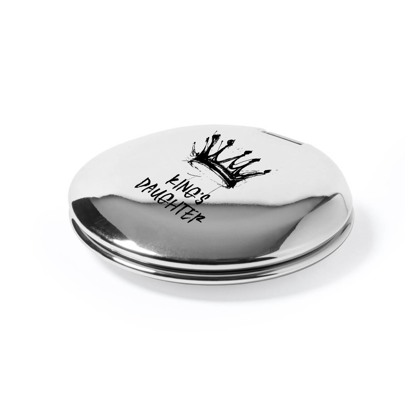 Stijlvol en compact spiegeltje in metallic uitvoering. Met ‘King’s Daughter’ en kroontje op de bovenkant