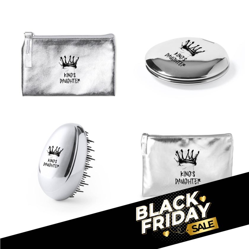 De set bevat een borstel, spiegel, portemonneetje en toilettas.