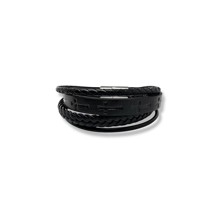 Een stoere leren armband met meerdere lagen en diepdruk kruisjes.