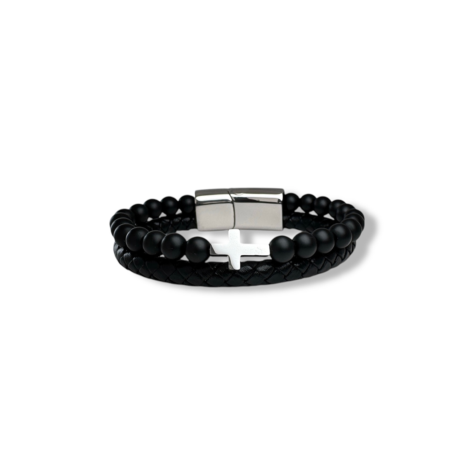 Leren kinderarmband met kraaltjes en een kruis voor stoere jongens en meiden. Dit armband is kleiner dan onze andere leren armbanden, waardoor het goed om een smalle pols past.