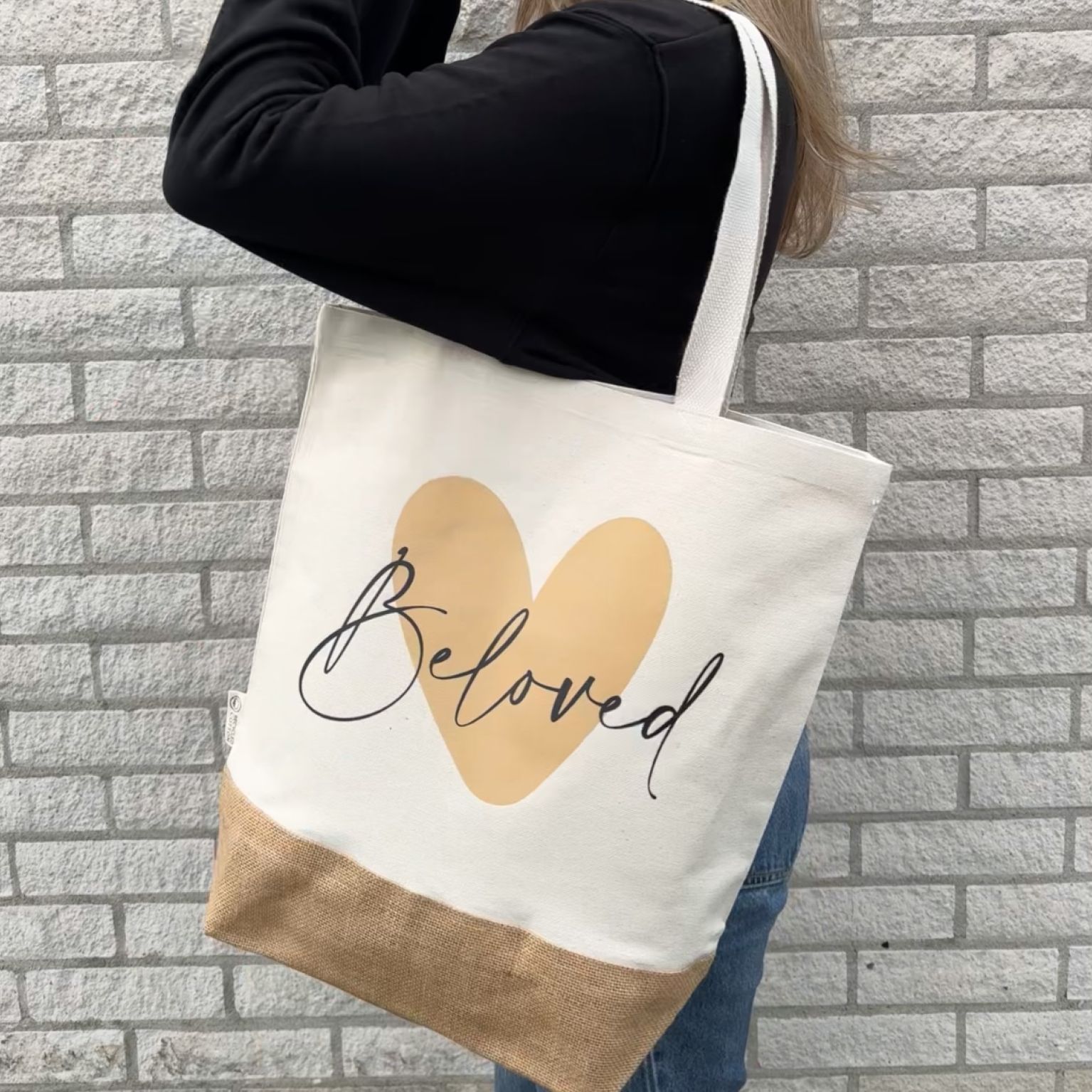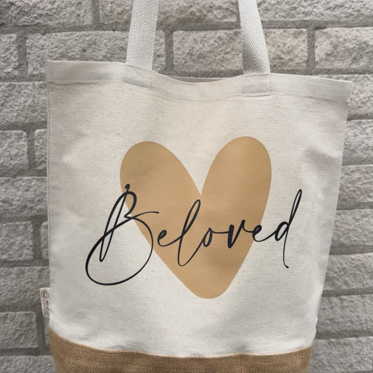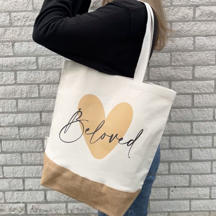 Linnen schoudertas bedrukt met de tekst ‘Beloved’. Afmeting 37×37 cm.