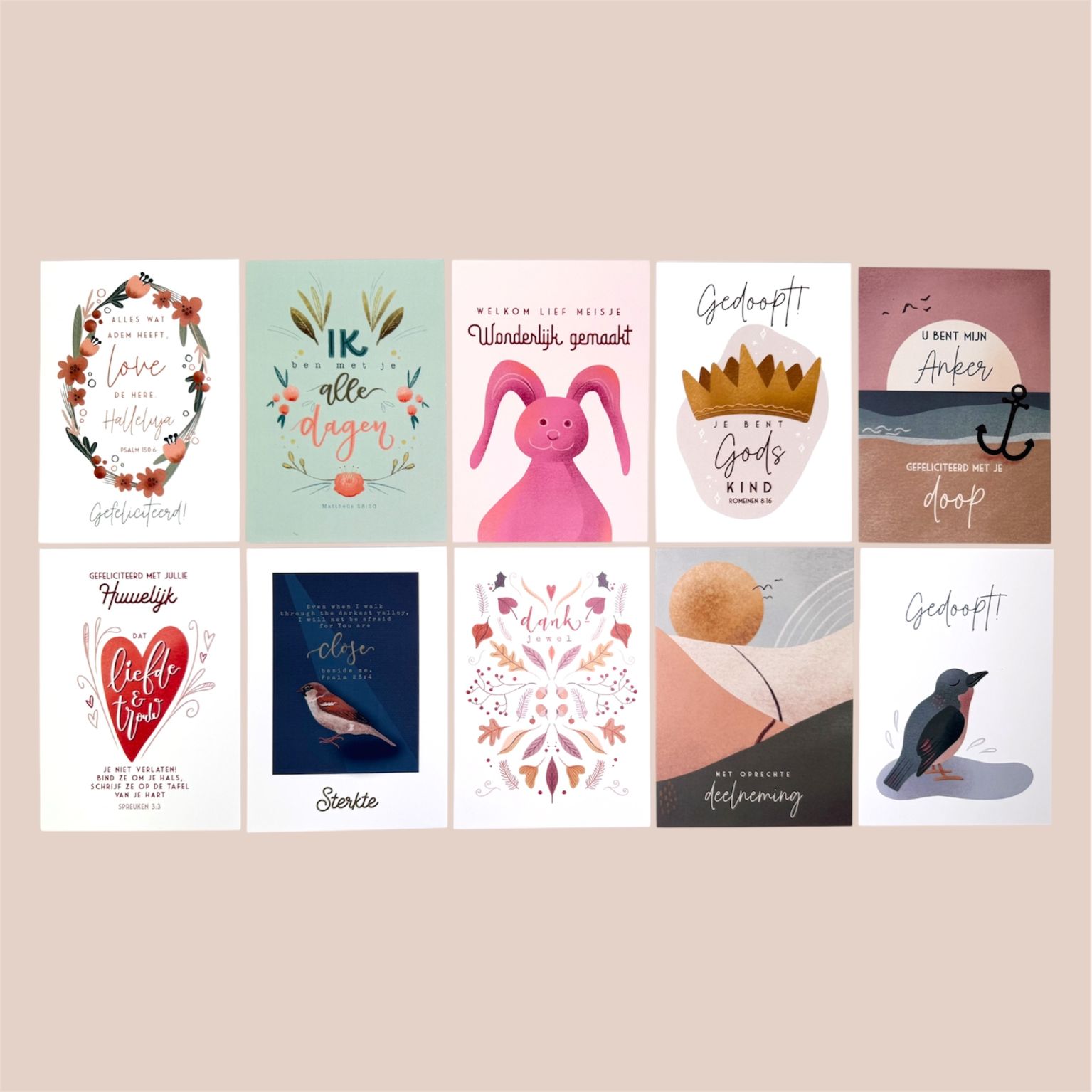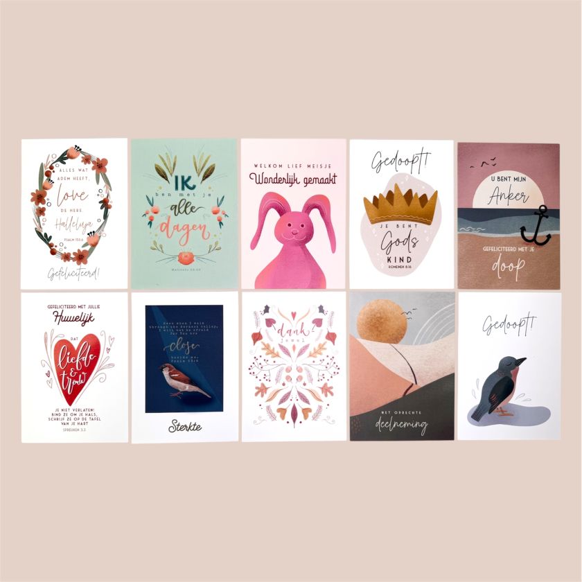Deze set bevat 10 kleurrijke christelijke kaarten van Marjoleins Creations met rechte hoeken, geschikt voor verschillende gelegenheden zoals doop, huwelijk, rouw of bemoediging. Met inspirerende (Bijbel-) deel je eenvoudig hoop en troost. Bestel nu en verras iemand met een bemoedigende kaart!