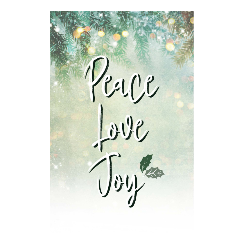 Dit leuke minikaartje voor Kerst met de tekst ‘Peace, Love, Joy’ is ontworpen in de Kerstsfeer. Perfect om een persoonlijke boodschap toe te voegen aan je cadeau, of om een liefdevolle boodschap aan een geliefde te schrijven. De kaarten hebben een blanco achterzijde, zodat deze goed beschreven kan worden.
