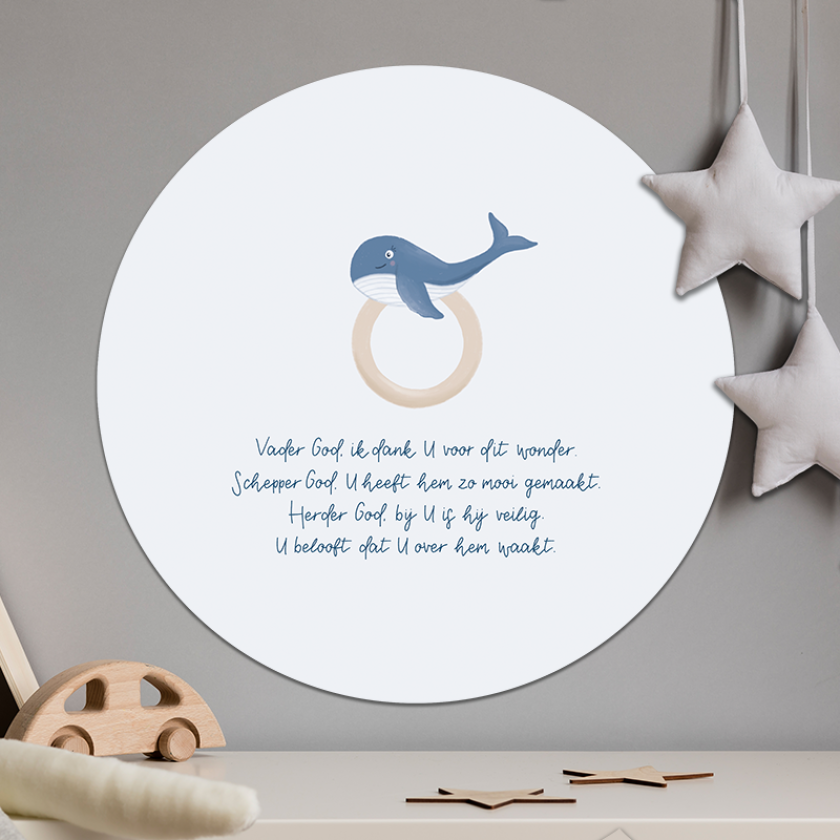 | Breng een liefdevolle sfeer in huis met deze neutrale muurcirkel, voorzien van de tekst uit Kinderopwekking 318: ‘Vader God, ik dank U voor dit wonder.’ De elegante sierletters en de blauwe walvis maken het perfect voor de baby- of kinderkamer. Een prachtige herinnering aan Gods liefde en dankbaarheid. Ook verkrijgbaar in meisjeseditie! |