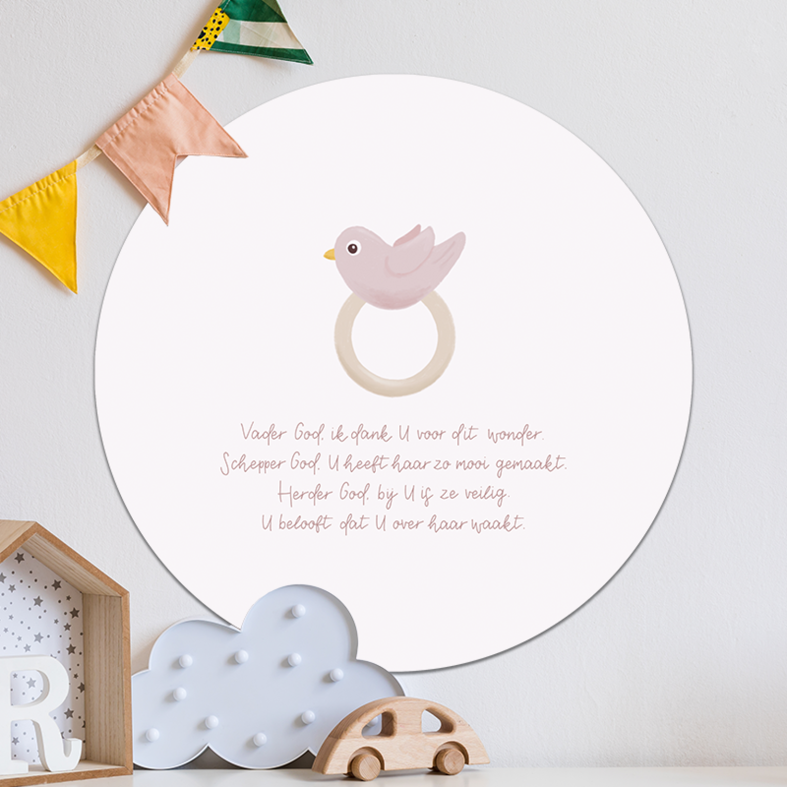 | Breng een liefdevolle sfeer in huis met deze neutrale muurcirkel, voorzien van de tekst uit Kinderopwekking 318: ‘Vader God, ik dank U voor dit wonder.’ De elegante sierletters en het schattige roze vogeltje maken het perfect voor de baby- of kinderkamer. Een prachtige herinnering aan Gods liefde en dankbaarheid. Ook verkrijgbaar in jongenseditie! |