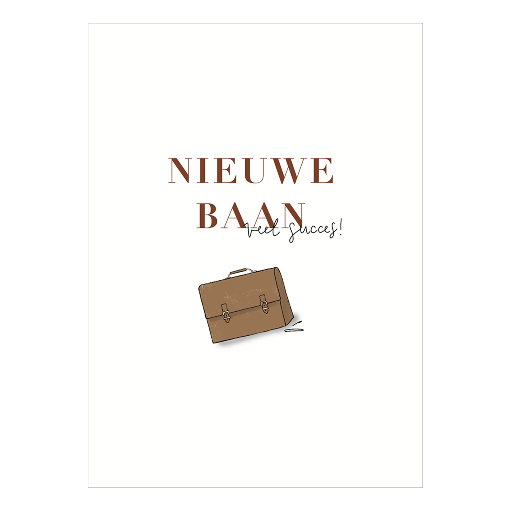 Een enkele kaart op dik papier met de afbeelding van een aktetas en de tekst ‘Nieuwe baan. Veel succes!’