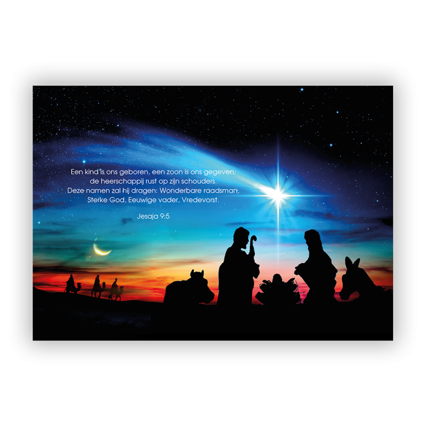 Duurzaam cadeaubord van plexiglas met afbeelding van een kerststal en de profetie over de Messias uit Jesaja 9:5-6.