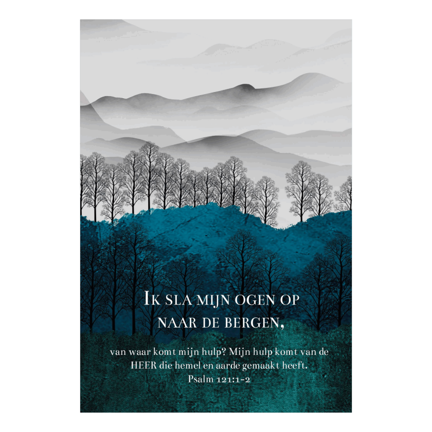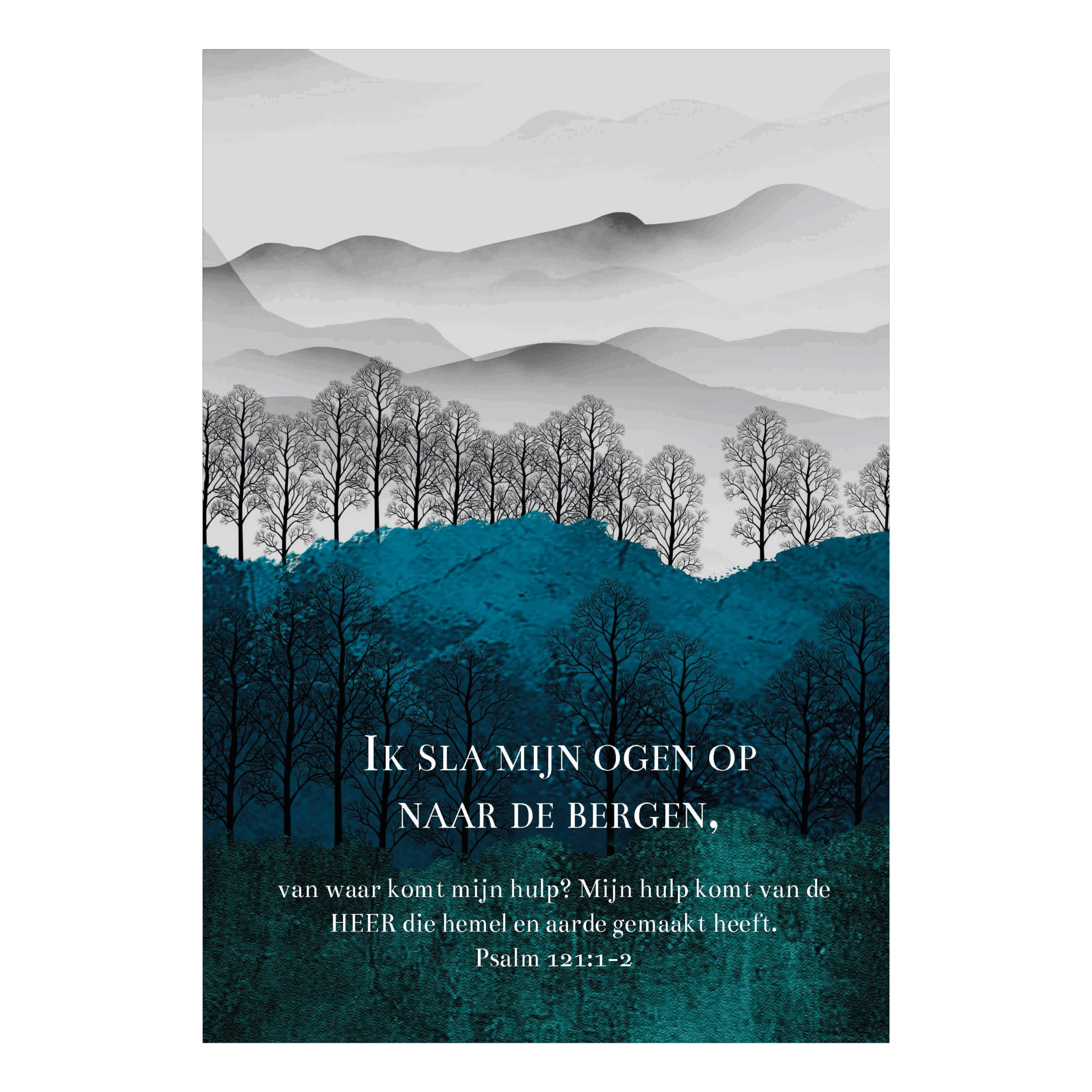 Poster met vers 1 van Psalm 121. Beschikbaar in A3-formaat en 50×70 cm. Deze poster is ook verkrijgbaar als kaart. (link naar MA55045)