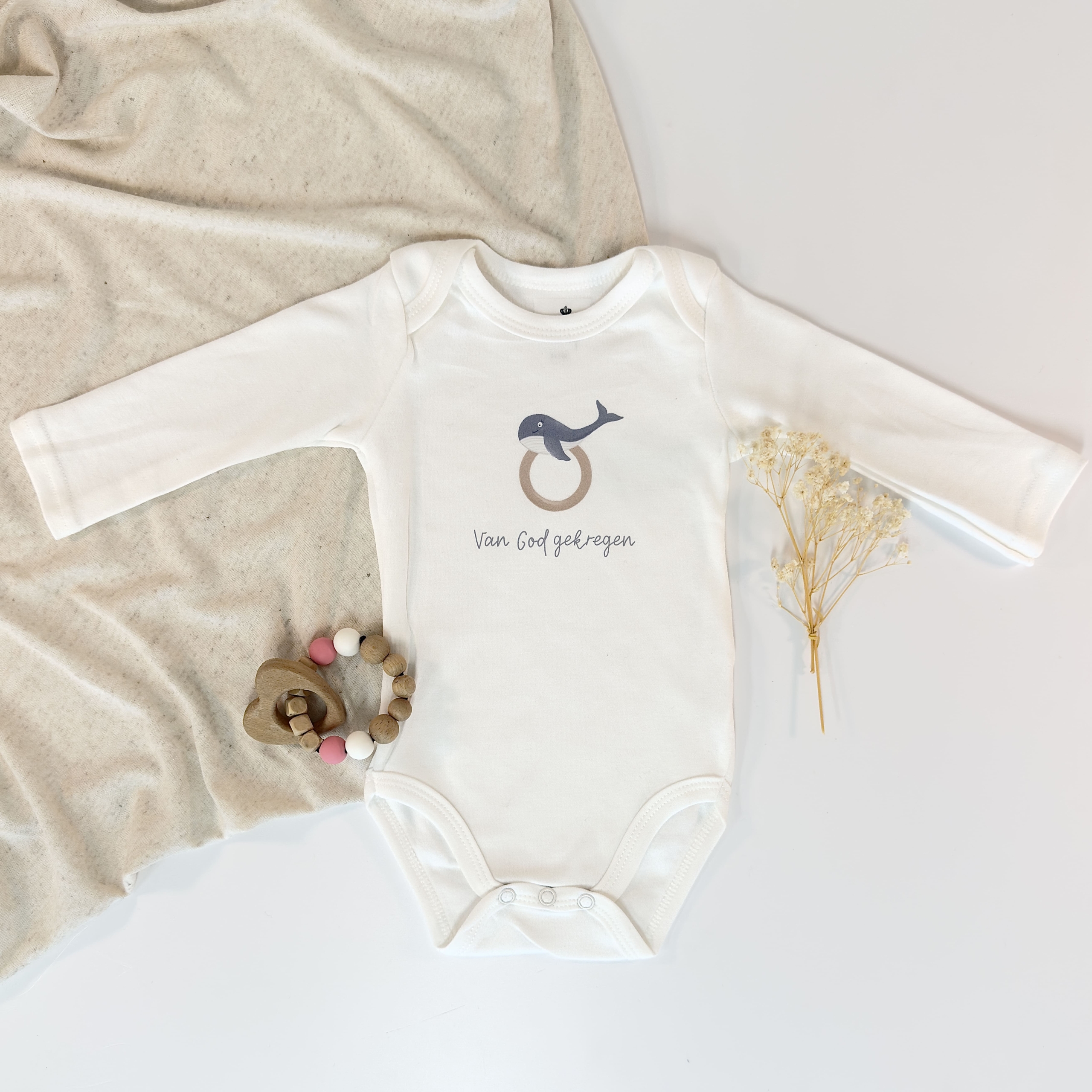 Dit zachte witte rompertje met de tekst ‘Van God gekregen’ en een blauwe walvis is een prachtig en betekenisvol kledingstuk voor je baby. Gemaakt van hoogwaardig katoen, perfect voor de gevoelige huid.