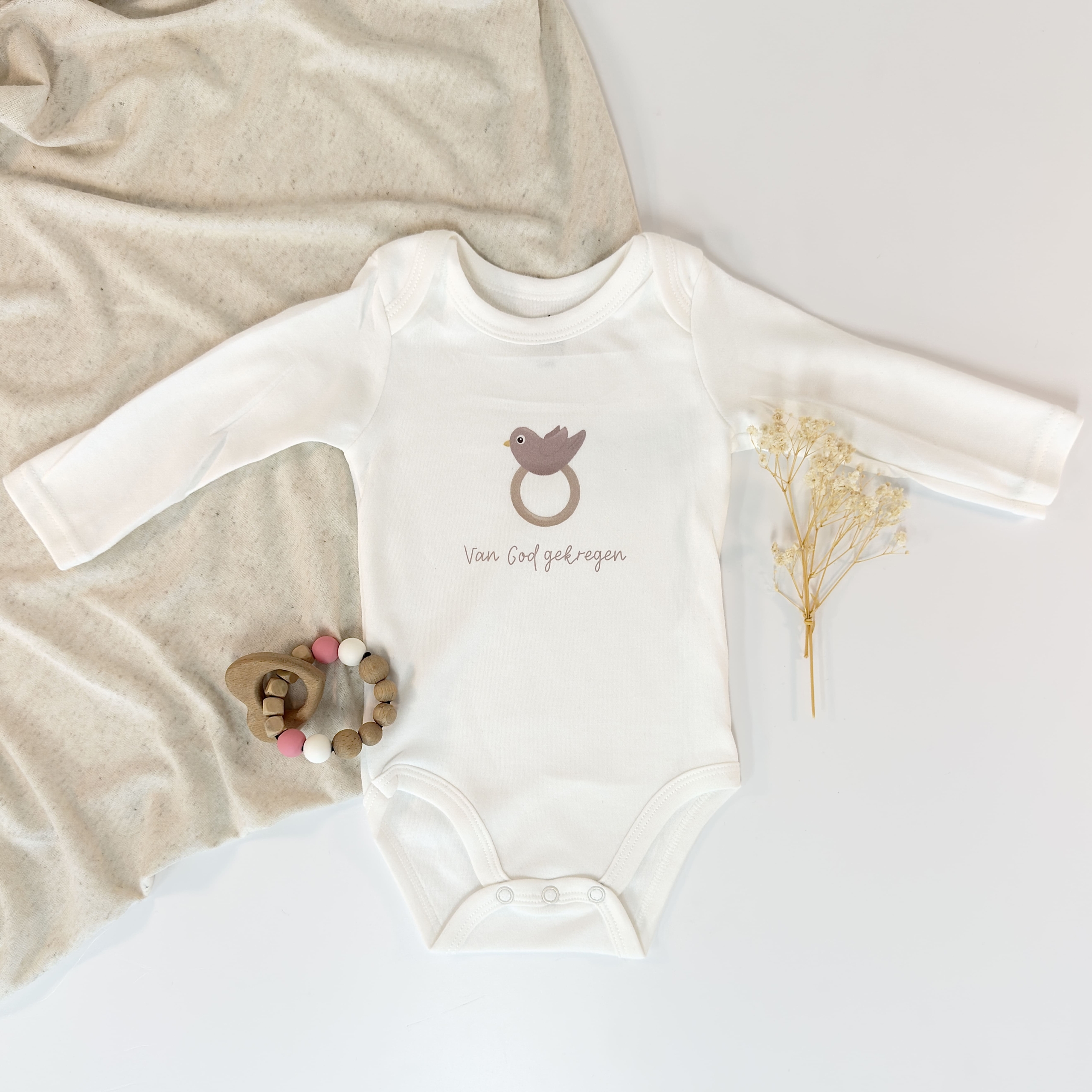 Dit zachte witte rompertje met de tekst ‘Van God gekregen’ en een roze vogeltje is een prachtig en betekenisvol kledingstuk voor je baby. Gemaakt van hoogwaardig katoen, perfect voor de gevoelige huid.