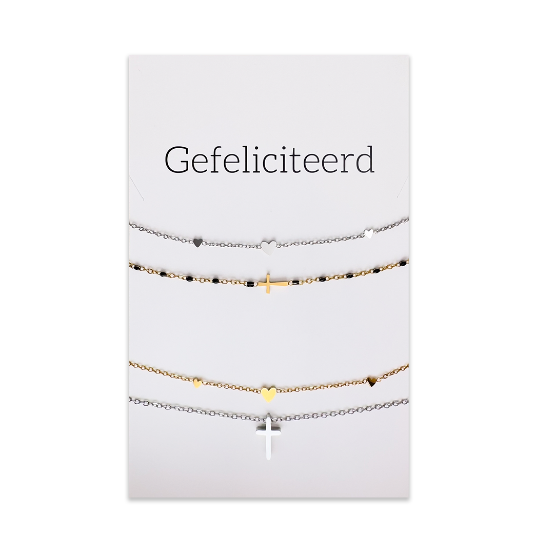 Deze set bevat een prachtige kaart met een armband of ketting. Kies uit 8 unieke combinaties of stel je eigen set samen door een losse kaart te combineren met een sieraad naar keuze.
