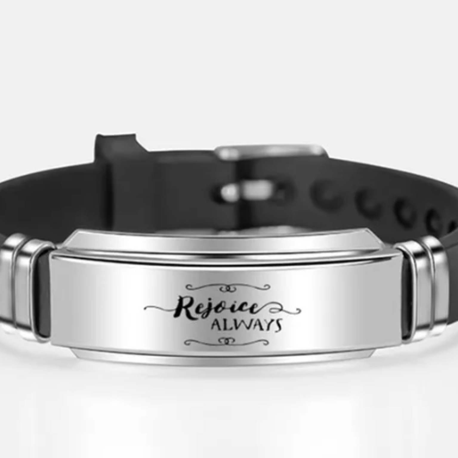 Stoere silliconenarmband met de inspirerende tekst: ‘Rejoice always’. Deze armband moedigt je aan om altijd verheugd te zijn, precies zoals de Bijbel ons leert in Filippenzen 4:4.