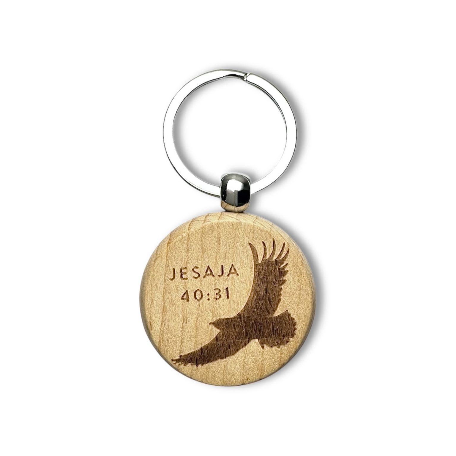 Leuke houten sleutelhanger met de tekst ‘Jesaja 40:31’.