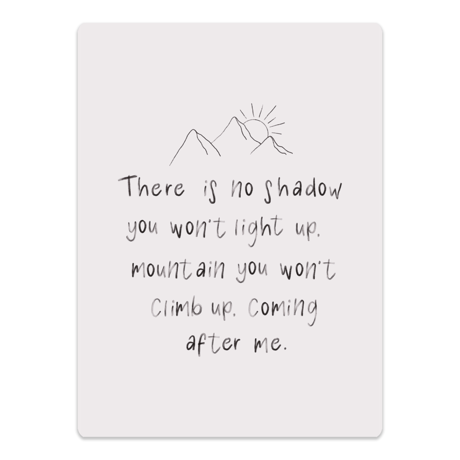 Inspirerend cadeaubord met de tekst "There is no shadow you won’t light up, mountain you won’t climb up, coming after me." uit het lied Reckless Love. Perfect als cadeau voor een geliefde of als bemoedigende toevoeging aan je interieur.