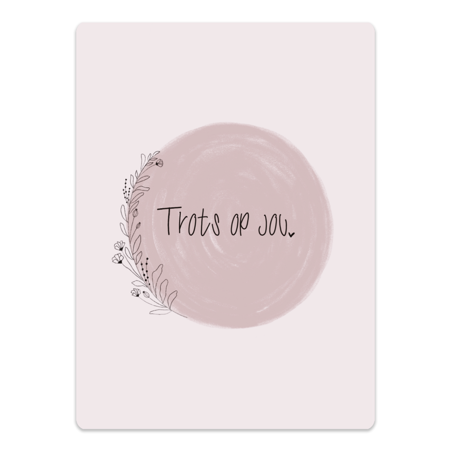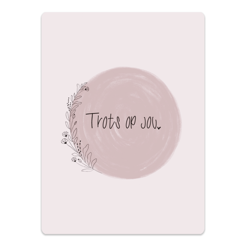 Verras iemand met dit cadeaubordje in roze tinten met de tekst "Trots op jou", omringd door een elegante bloemenkrans. Een prachtig geschenk om waardering en trots te uiten.