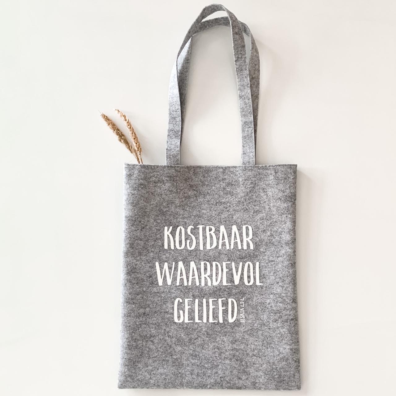 Grijze vilten tas met opdruk ‘Kostbaar Waardevol Geliefd Jesaja 43:4’. De tas is ca. 41×33 cm. Leuk om mee te nemen op je dagje uit!