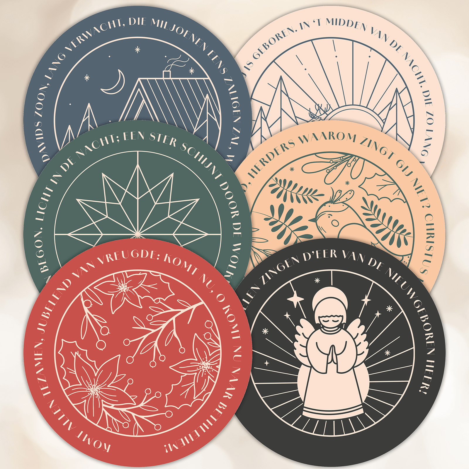 Ontdek deze set van 12 ronde kerstkaarten in lichte kleuren.