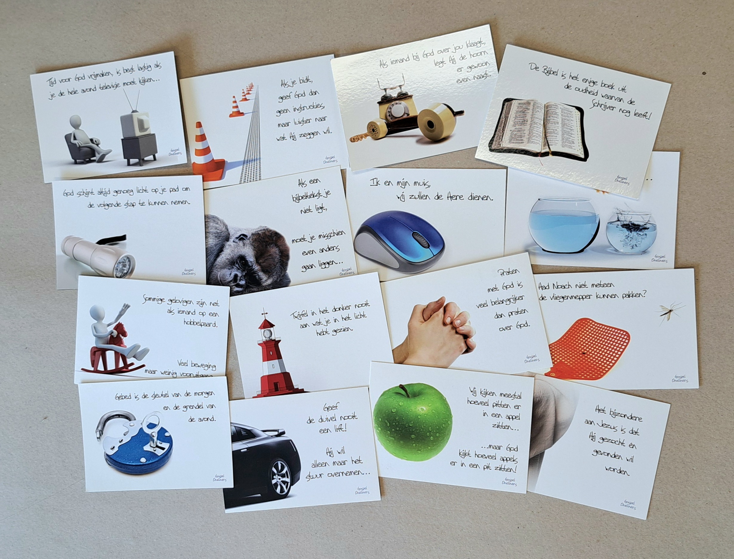Pakket met assortiment van 30 ansichtkaarten uit de Gospeloneliner serie.
