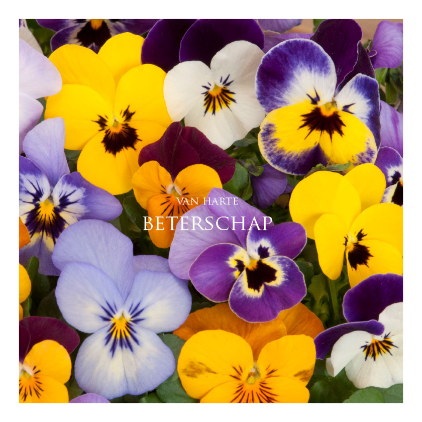 Deze vierkante, dubbele wenskaart (ca. 15 x 15 cm) is mooi om te sturen bij ziekte om iemand beterschap te wensen. Wordt geleverd met envelop.